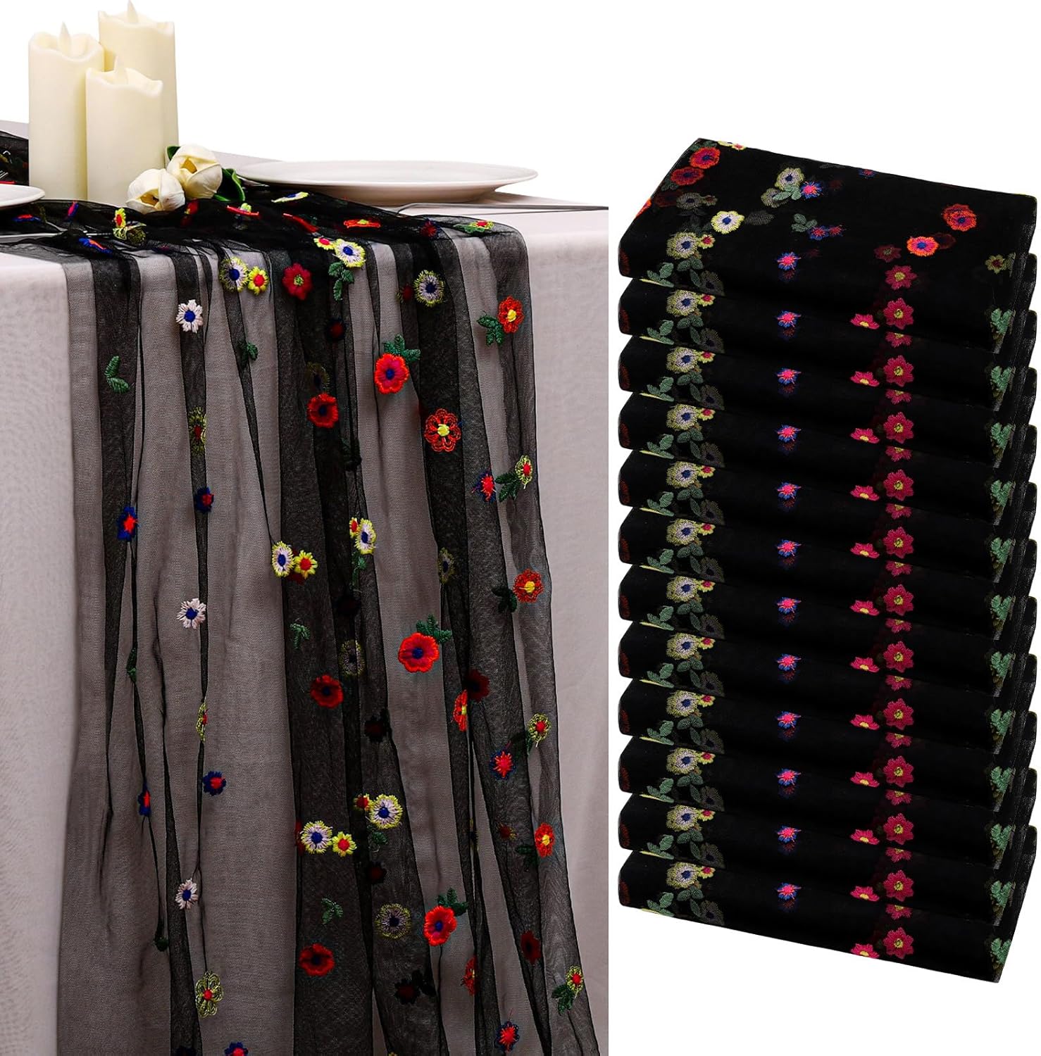 BINBE 12pcs Daisy Fall Table Runner Embroidery Gauze 10FT Florals Seasonal Tulle Holiday Birthday Kitchen Dining Table Decor for Home Party Black