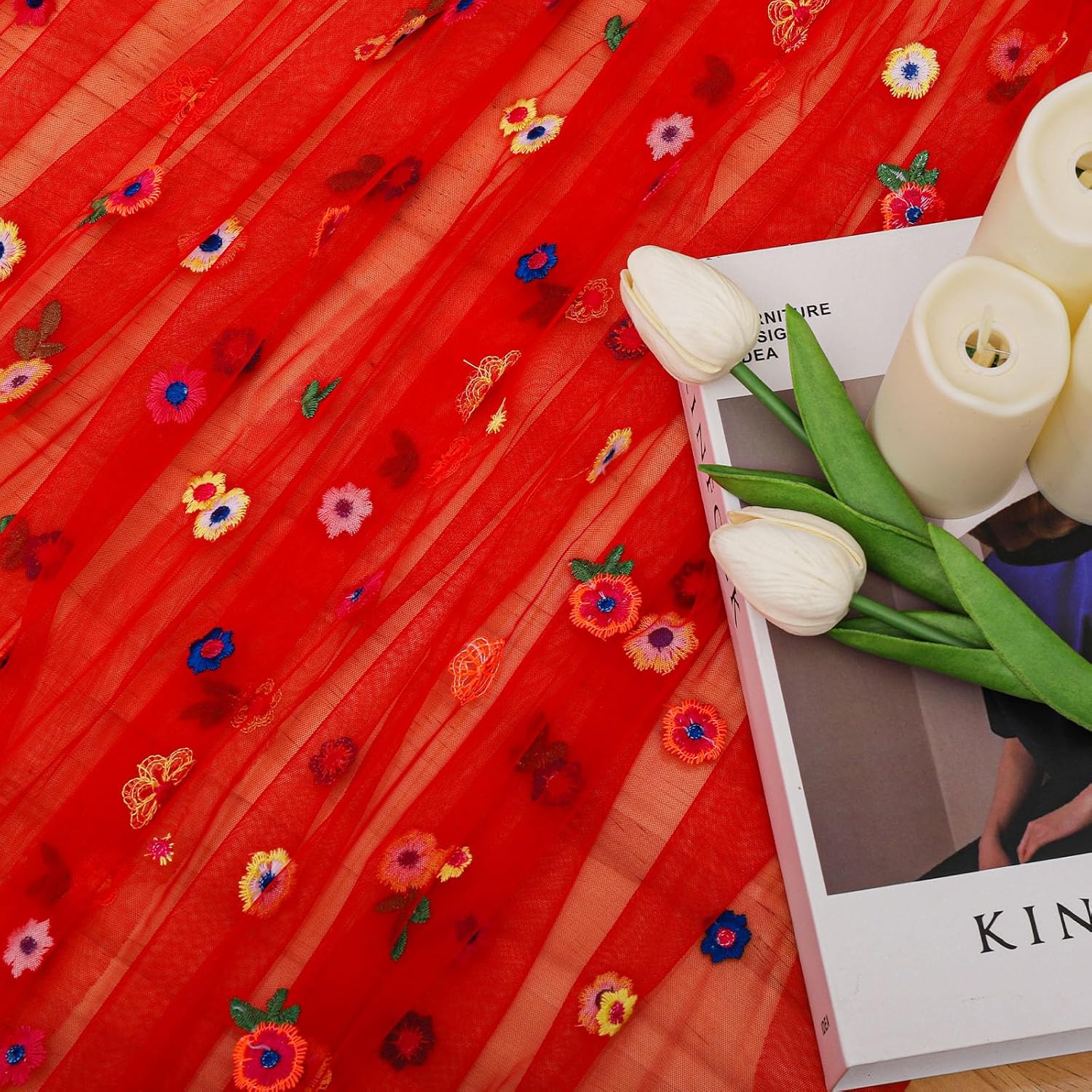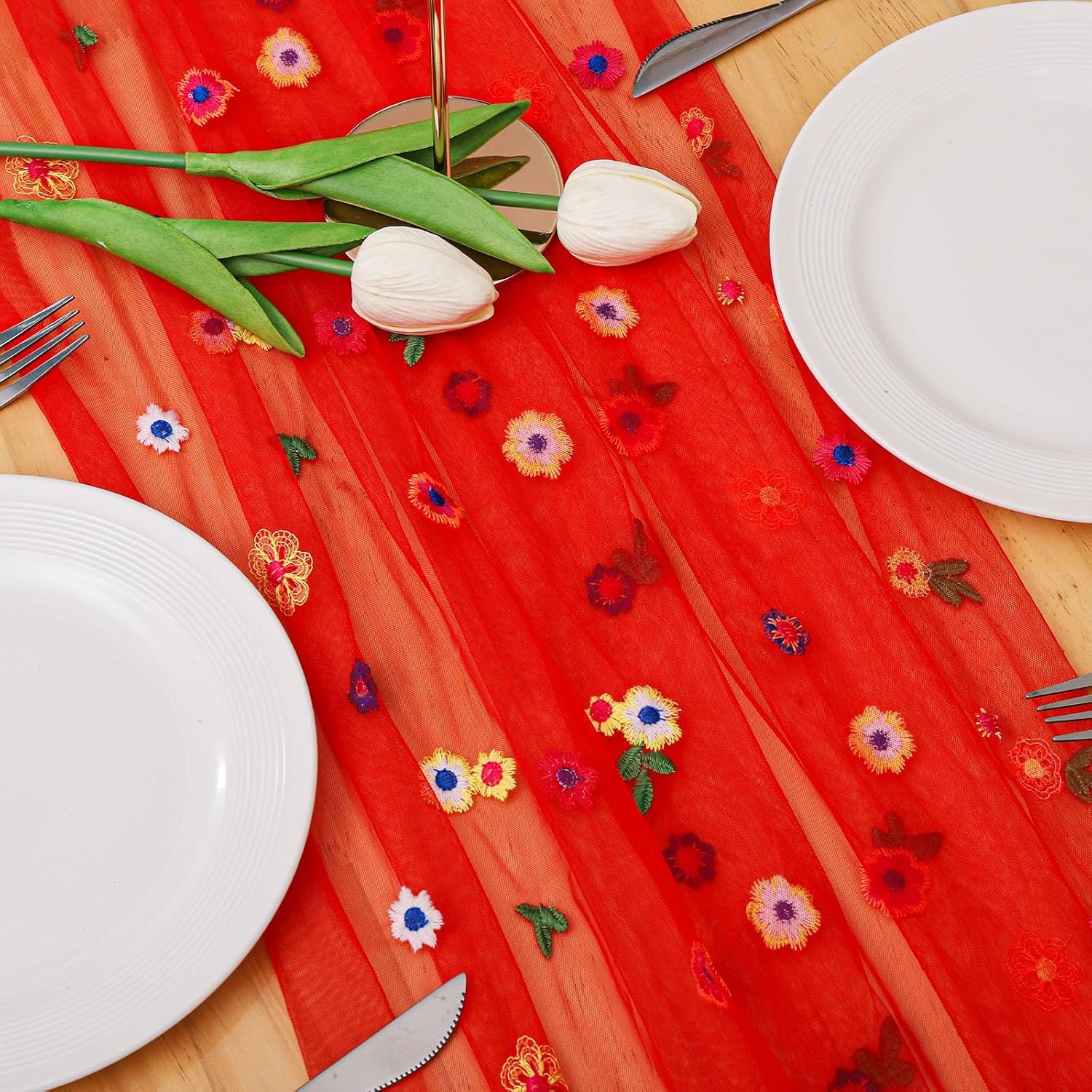 BINBE 6pcs Daisy Fall Table Runner Embroidery Gauze 10FT Florals Seasonal Tulle Holiday Birthday Kitchen Dining Table Decor for Home Party Red