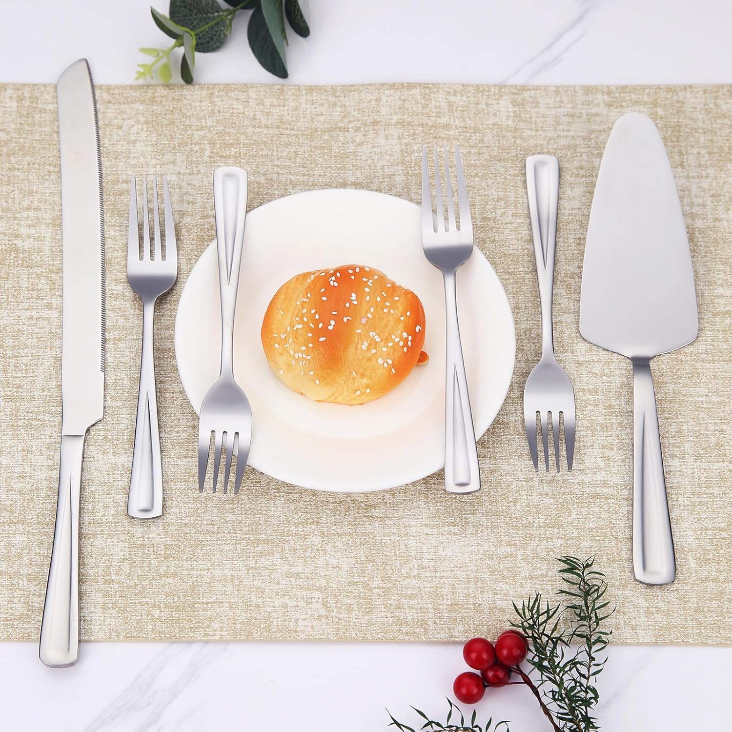 - All-in-One Serving Solution: Includes 1 pc cake knife, 1 pc cake pie server spatula and 4 pcs salad forks β perfectly sized to slice, lift, and serve cakes/pies while keeping hands clean.