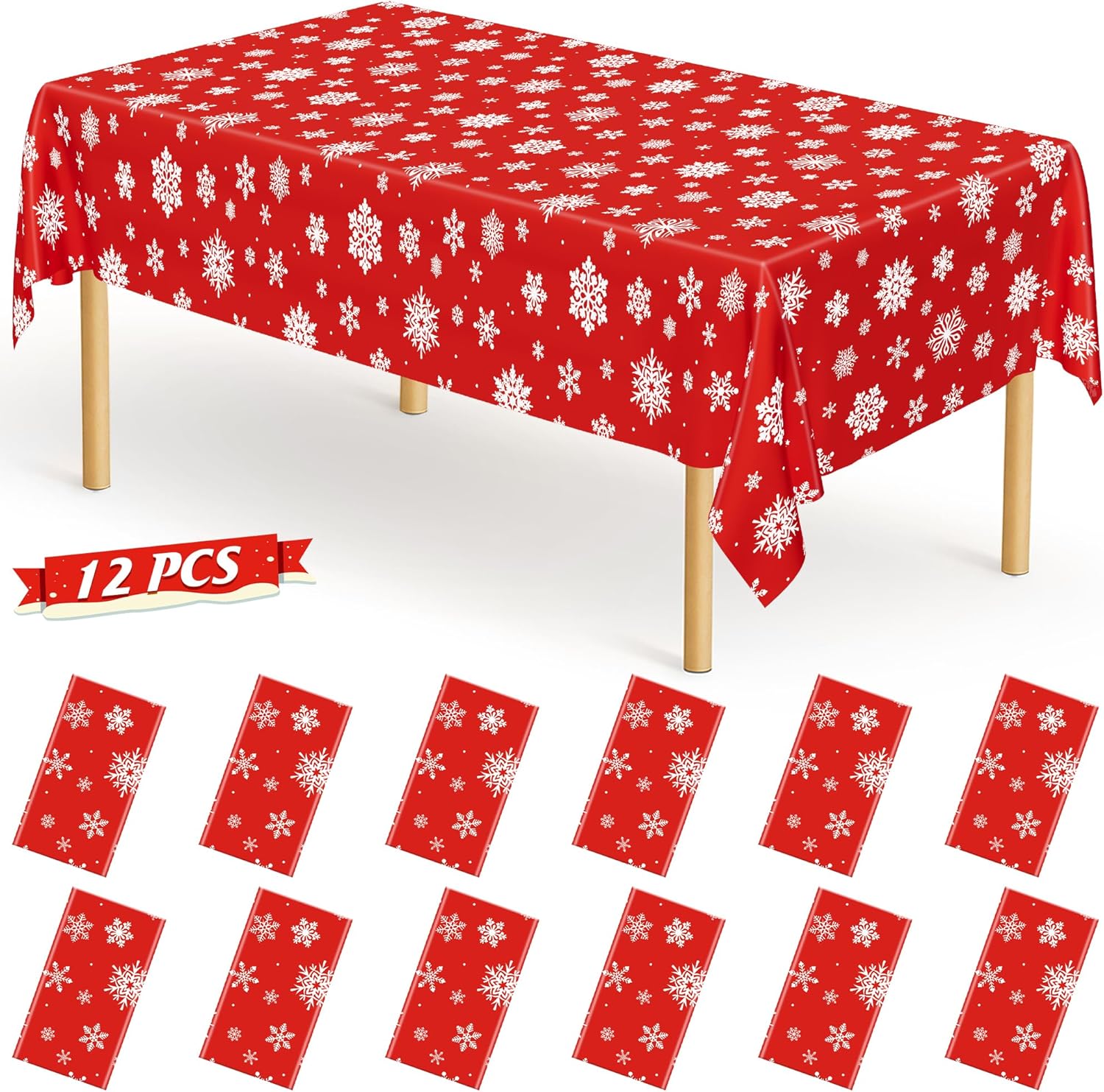 - Snowflakes Design: This plastic Christmas tablecloth features a red background adorned with countless white snowflake patterns, making it suitable for your Christmas party.