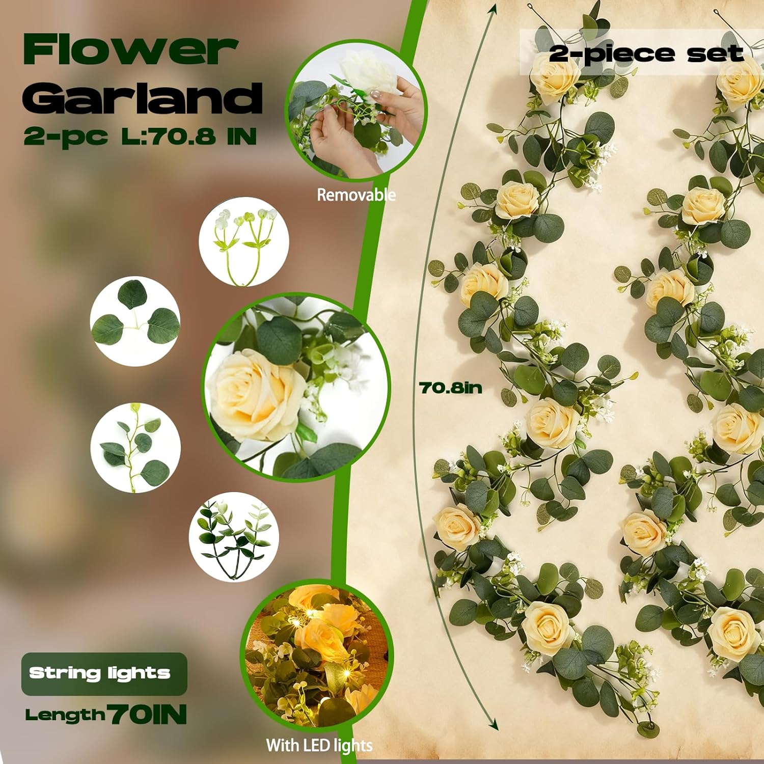 - Versatile Applications: With their gorgeous colors and romantic style, our floral garlands are suitable for any season or occasion. This combination is ideal for large spaces such as wedding arches, rooms, backdrops, mantels, and more. Look forward to creating magical floral arrangements with our rose garlands.