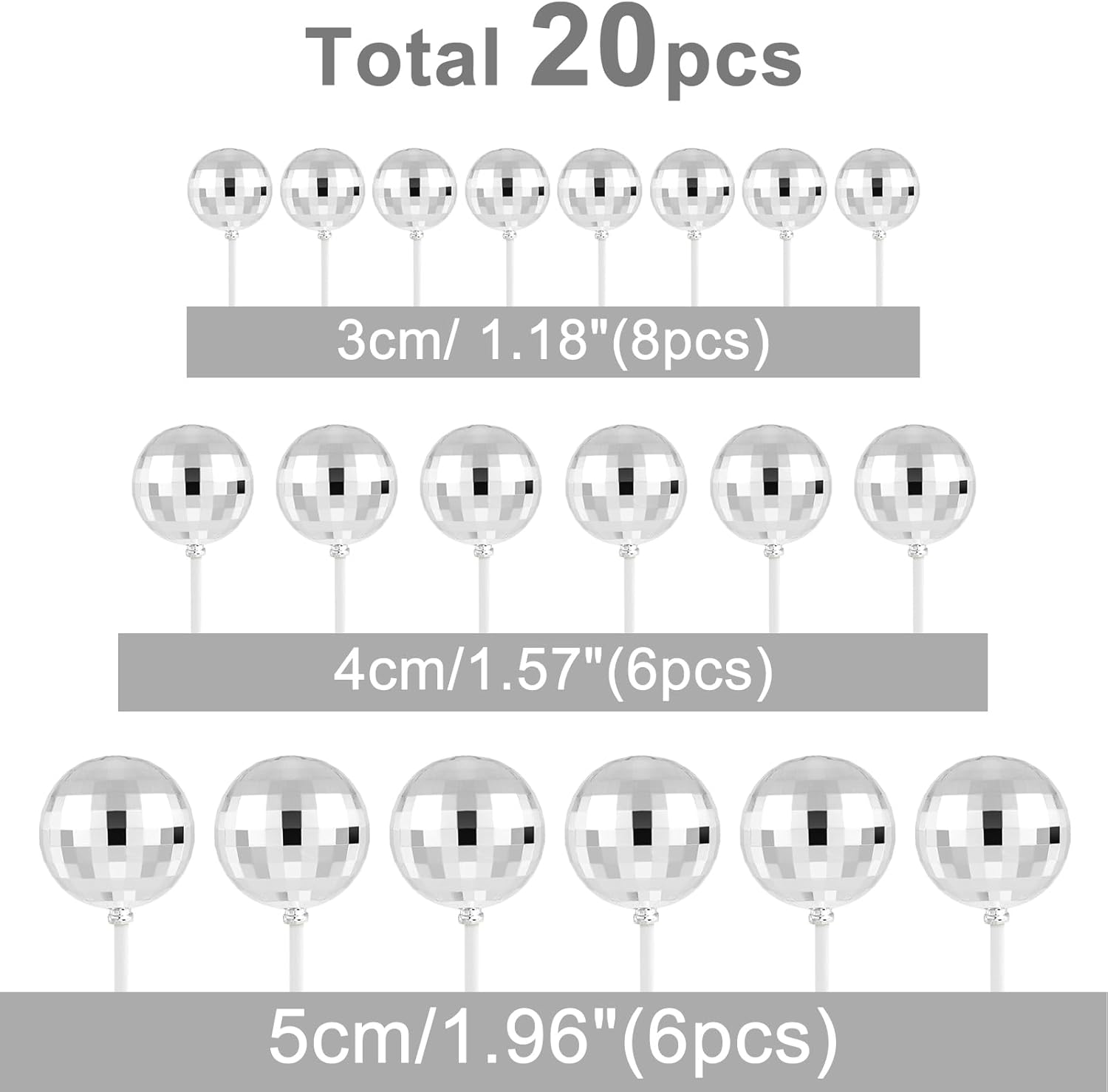 - Package includes: 20 pcs silver disco balls for cake decorations. there are 8 balls with a diameter of 1.18 inches/ 3 cm, 6 balls with a diameter of 1.57 inches/ 4 cm๏ผ6 balls with a diameter of 1.96 inches/ 5 cm.