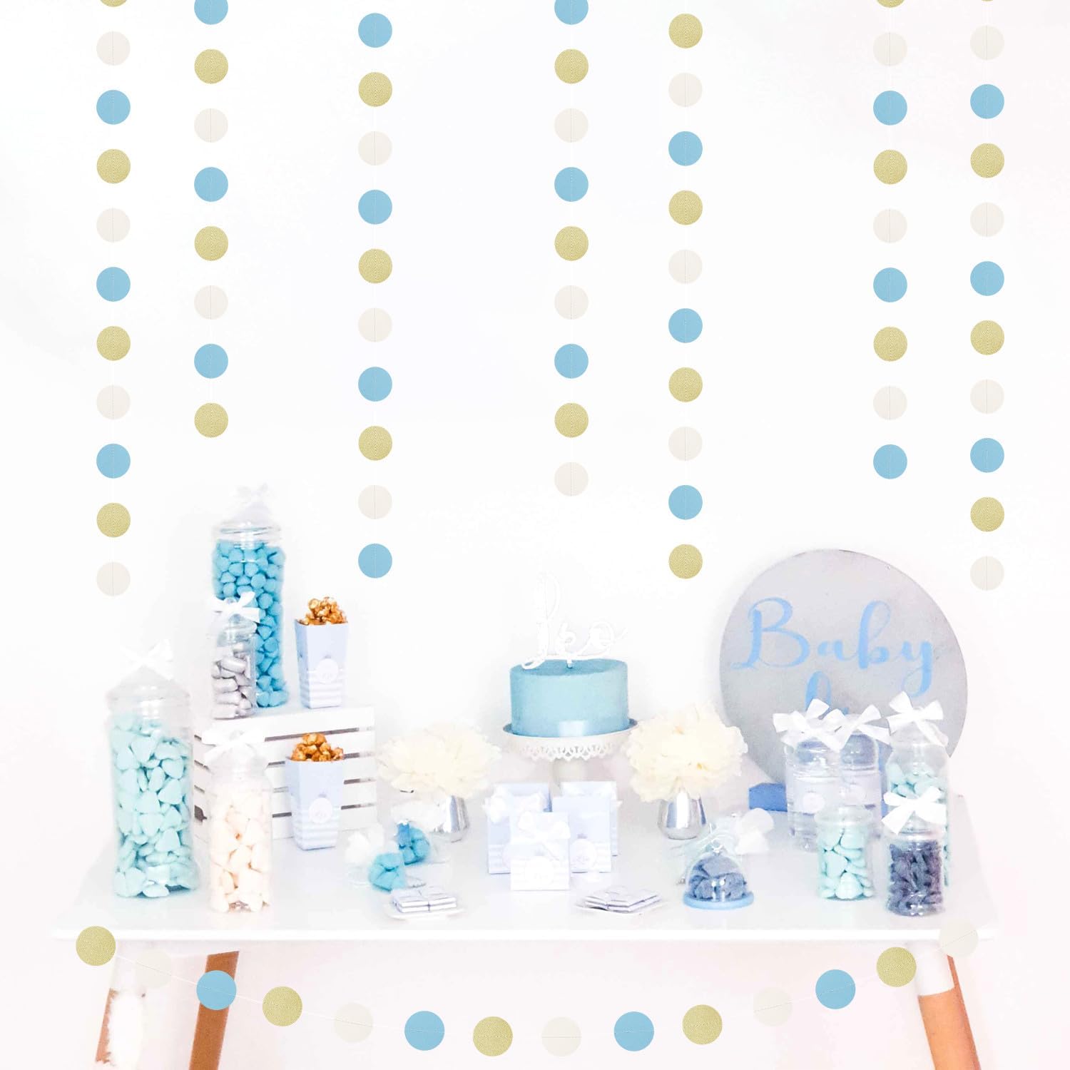 - 【Material】The material is eco-friendly colorful paper,Dusty-Blue Beige Gold.You can cut to any length you want if you need shorter length.The dots cut very neatly.