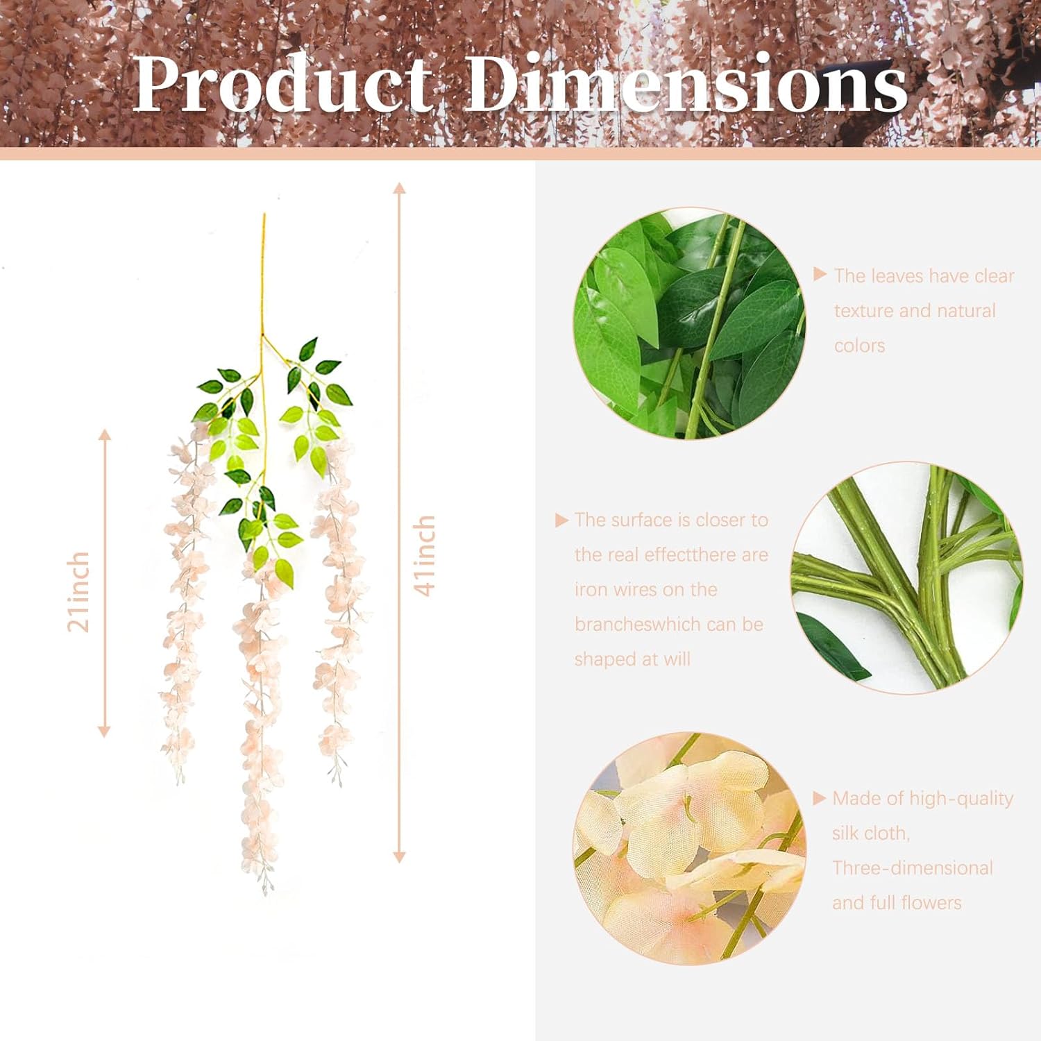 - 【Package Included】24 pieces of champagne&pink silk hanging flowers, each length 41 inches. Every artificial wisteria garland has 3 branches and 6 leaves, the wisteria flower petal length is 21 inches. (Note: There is a little green in the middle of the petals, If the petals fall off, you can install it according to the instructions or contact us by email if you have any questions.)