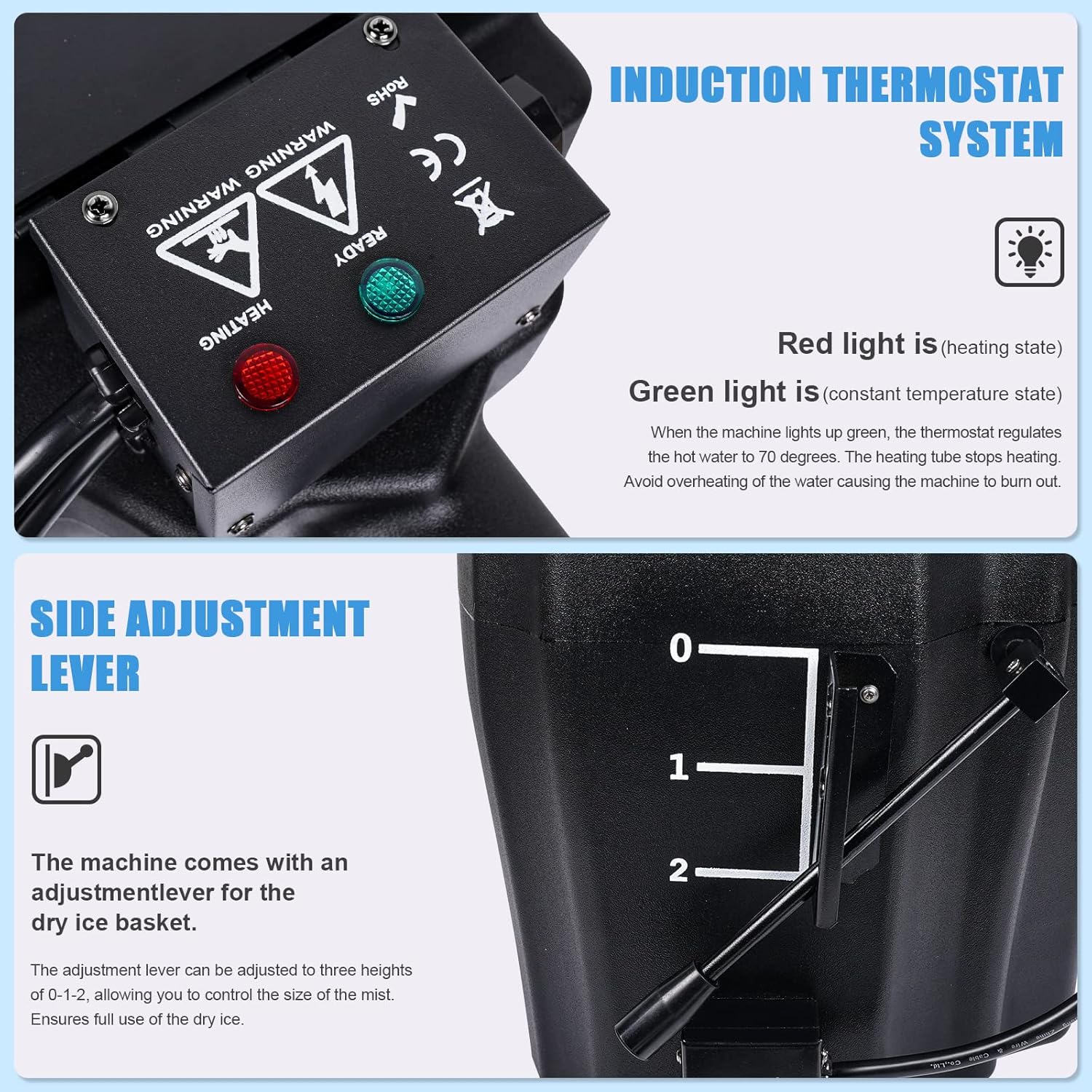 - How to Use: Pour water, connect power, and turn on. Wait for green light to indicate heating is complete. Raise handle, insert dry ice, close lid, and lower handle. Machine will produces smoke