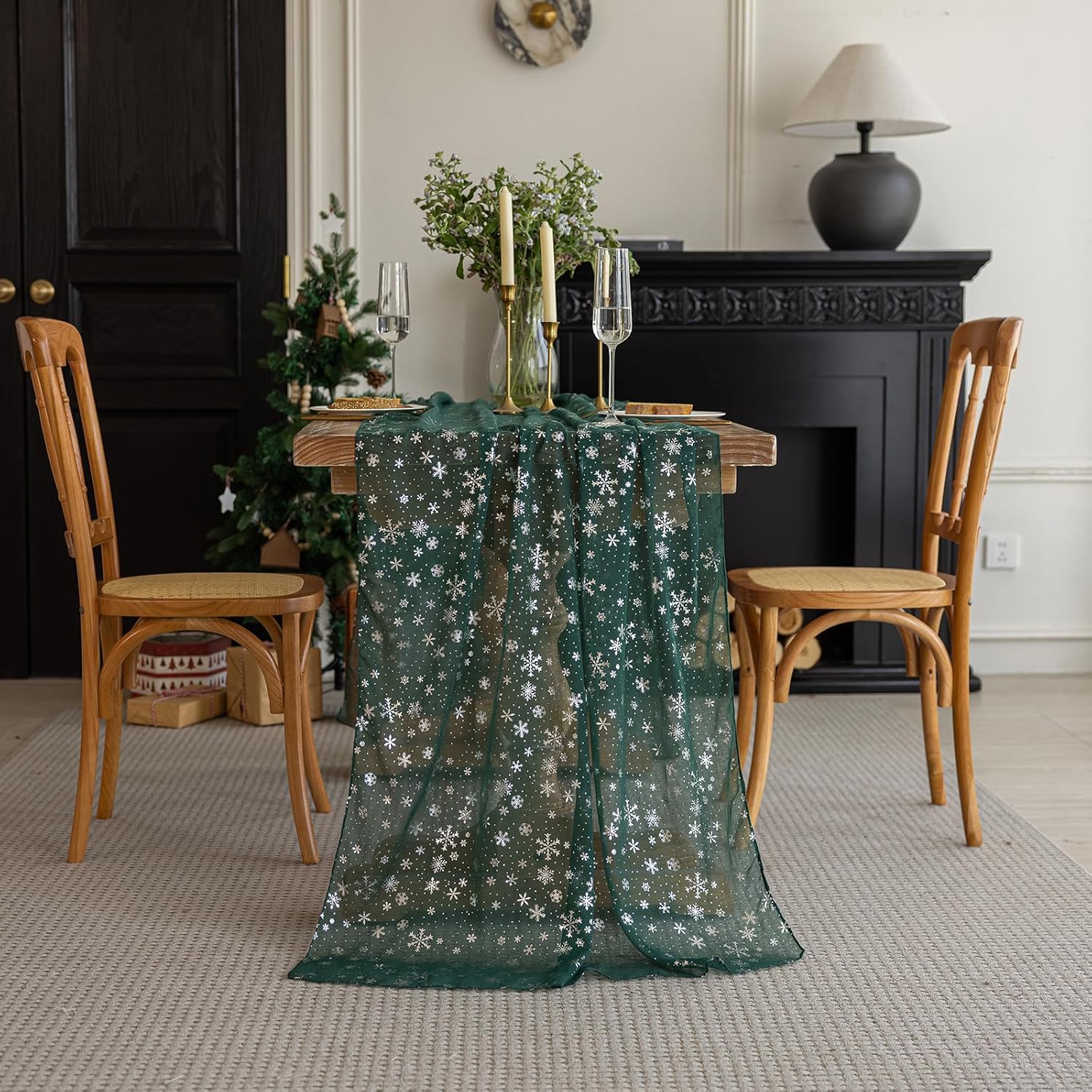 - Foil-Printed snowflakes shimmering metallic design catches the light beautifully.Versatile decor works for christmas, weddings, parties, and home styling.120" length fits standard dining tables with elegant drape . sheer tulle fabric lightweight yet durable, won’t wrinkle easily