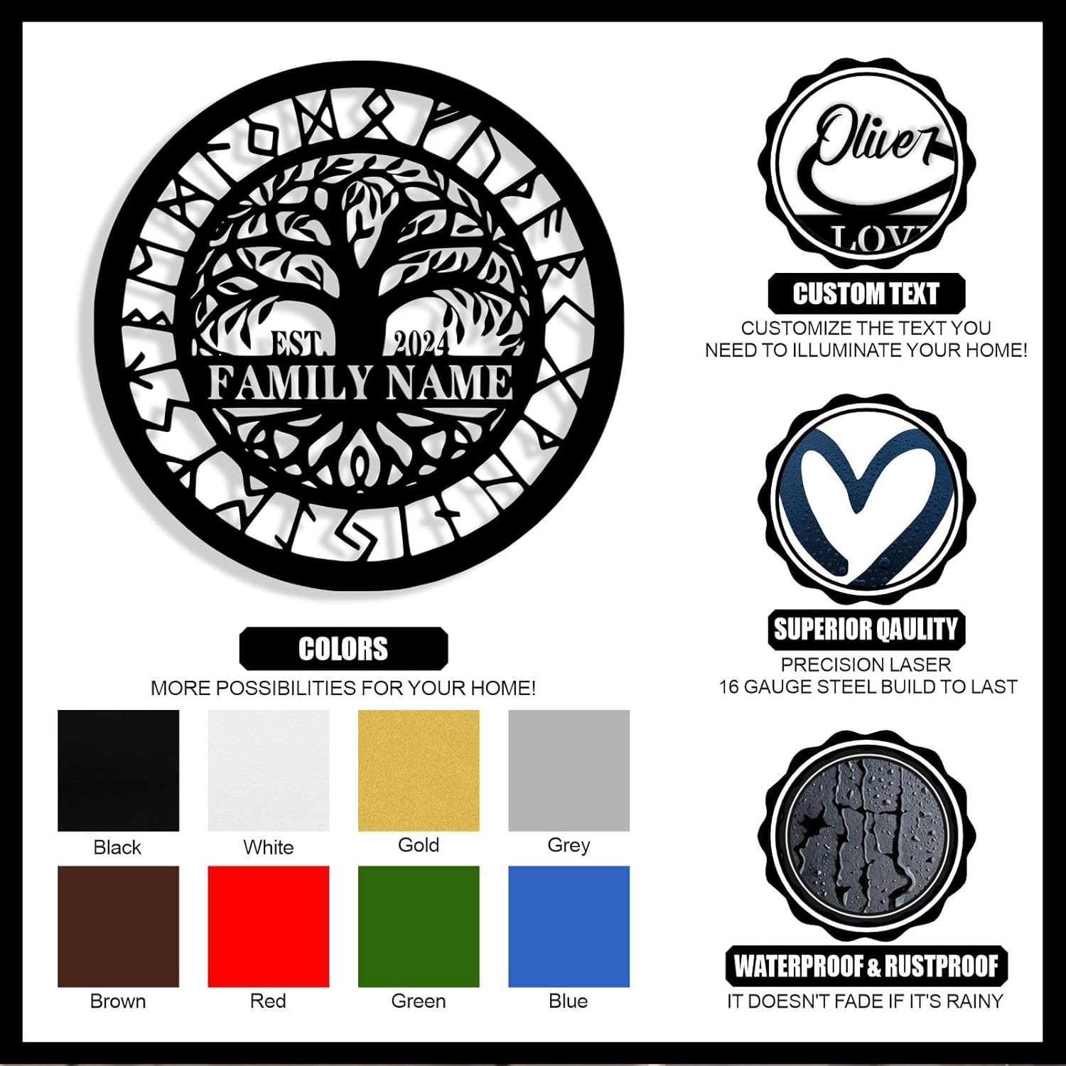 - Sturdy Material -- Our custom tree of life metal sign is crafted from sturdy 16 gauge steel with unique laser technology. The custom signs are powder coat finished. The surface is smooth, free of burrs, waterproof, anti-fading, can keep it use for years.