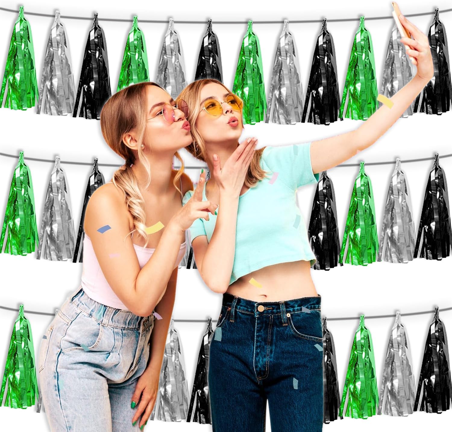 3P Black Silver Green Metallic Fringe Tassel Banner Garland Foil Tinsel Streamer Wall Hanging Curtain Backdrop Banner for Parade Floats, Graduation Decorations, Halloween, Christmas Decorations