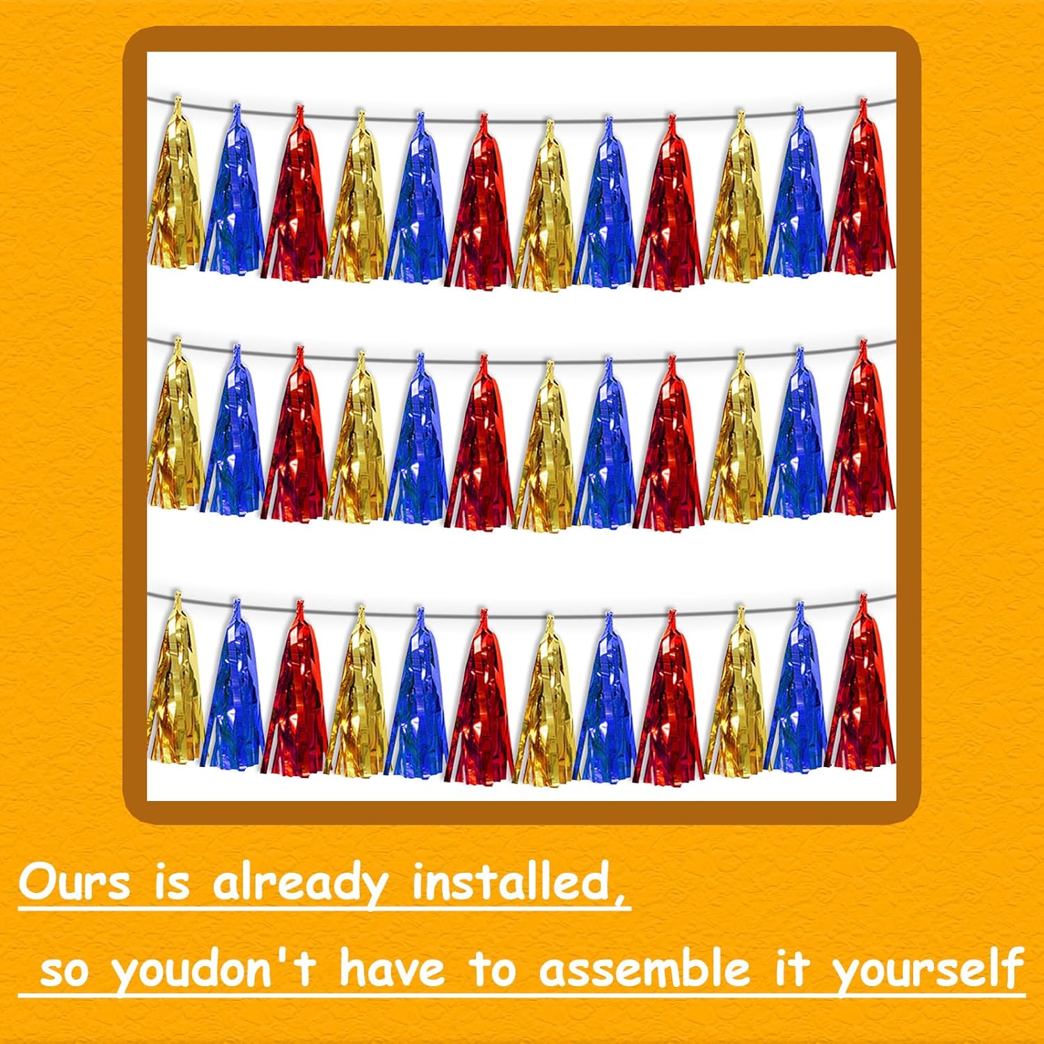 - 【Package Includes】The total length of the Gold Blue Red birthday tassels banner is 30 feet, divided into 3 strips, each 10 feet long. Each banner contains 15 tassels, and each tassel measures 14 inches, for birthday decorations many occasions uitable for Patriotic display, omecoming Float, Christmas Float, ecorative metal trailers, graduation floats etc