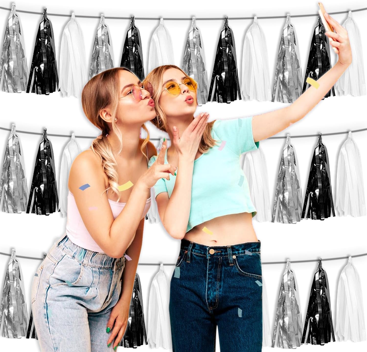 - 【Package Includes】The total length of them Black Silver white birthday tassels banner is 30 feet, divided into 3 strips, each 10 feet long. Each banner contains 15 tassels, and each tassel measures 14 inches, for birthday decorations many occasions uitable for Patriotic display, Homecoming Float, Christmas Float, ecorative metal trailers, graduation floats etc