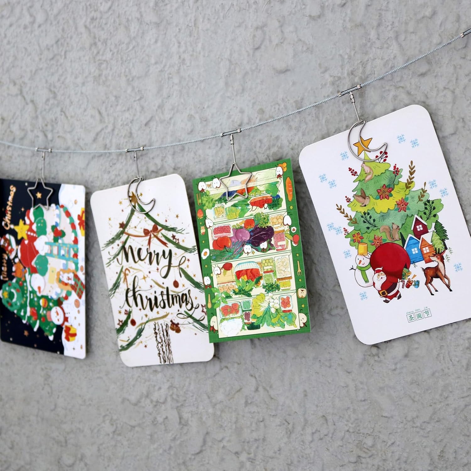 2 Pack Chain Photo Clip Hanging Photo Display Wall Photo Display Metal Photo String with 12 Clips Wall-Mounted Picture Holder for Hanging Painting Family Photos Artworks (Silver-Star and Moon)