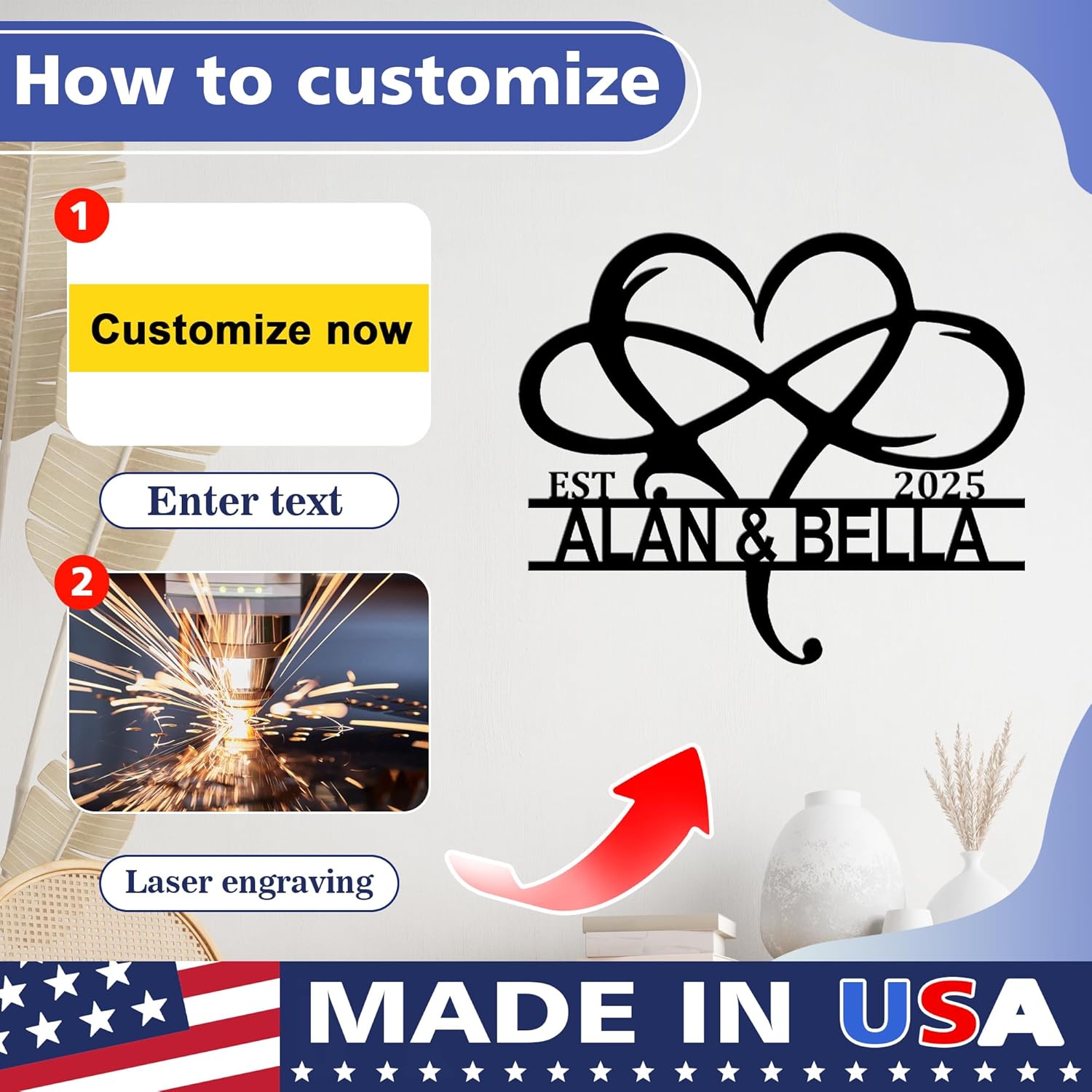 - CUSTOM MONOGRAM METAL SIGNS: Our metal signs are made in the USA, ship quickly. We offer a variety of designs and sizes to choose from. You can customize your name, last name, and anniversary date as a home decor sign, living room wall decor sign, or wedding sign. It is not only the perfect home decoration, but also an excellent way to showcase beautiful memories.