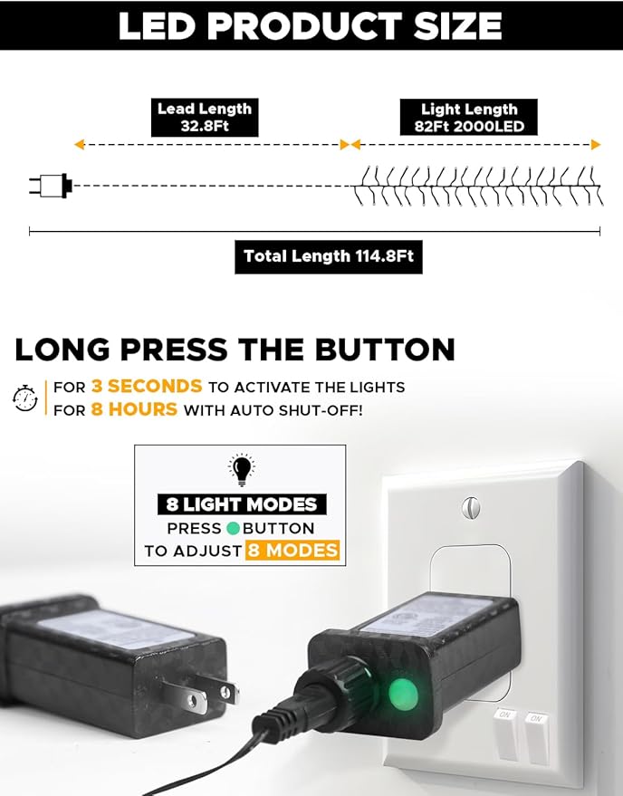 - 8 Lighting Modes & Memory Function : Bring your tree to life with 8 lighting effects steady on, wave, slow fade, chasing flash, and twinkle. The memory function saves your preferred mode, so your twinkle cluster lights warm white shine perfectly every evening. Ideal for twinkle lights for Christmas tree, twinkling cluster Christmas tree lights, and firecracker Christmas lights that make your home glow.