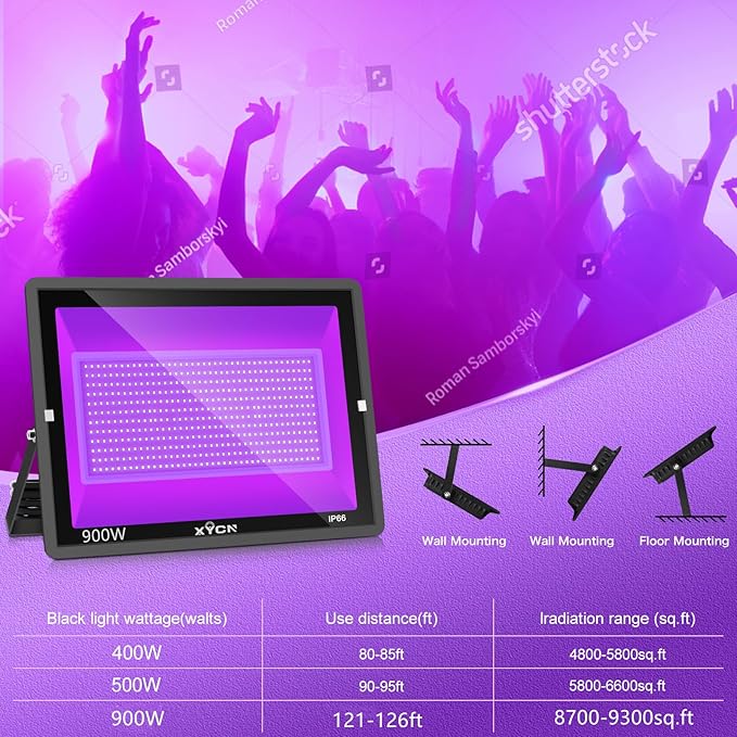 - POWERFUL 900 Watt Big BLACK LIGHTS:120 degree wide beam angle, each 900W Super power blacklight flood light can cover a spacious living room, yard or other outdoor party spot. The wavelength is 395-410 nm