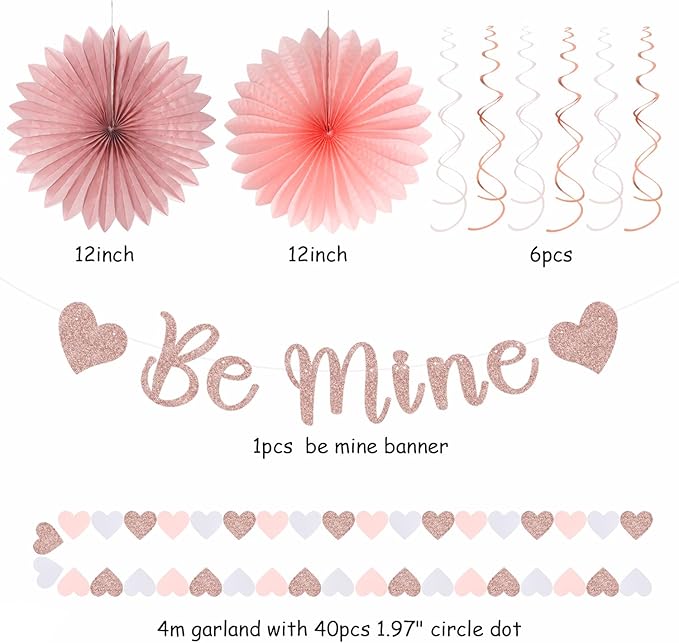 - Package Includes: This kits include 1pcs be mine banner, 1pcs heart love garland, 4pcs tissue pom poms flowers, 2pcs paper lanterns, 4pcs heart honeycomb lanterns, 4pcs paper flower fans, 6pcs paper swirls hanging streamers in blush light pink white rose gold colors, and different sizes