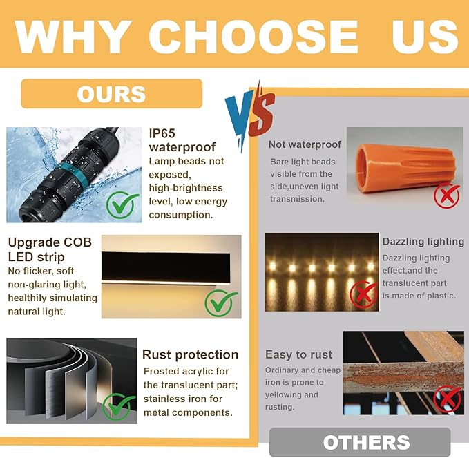 - [No flicker] Our linear outdoor wall sconce are made of high-quality light source materials, with a light source of more than 50,000 hours, a 3000K low color temperature light source + no flicker design, protecting your family's visual comfort and avoiding dazzle when returning home late at night.